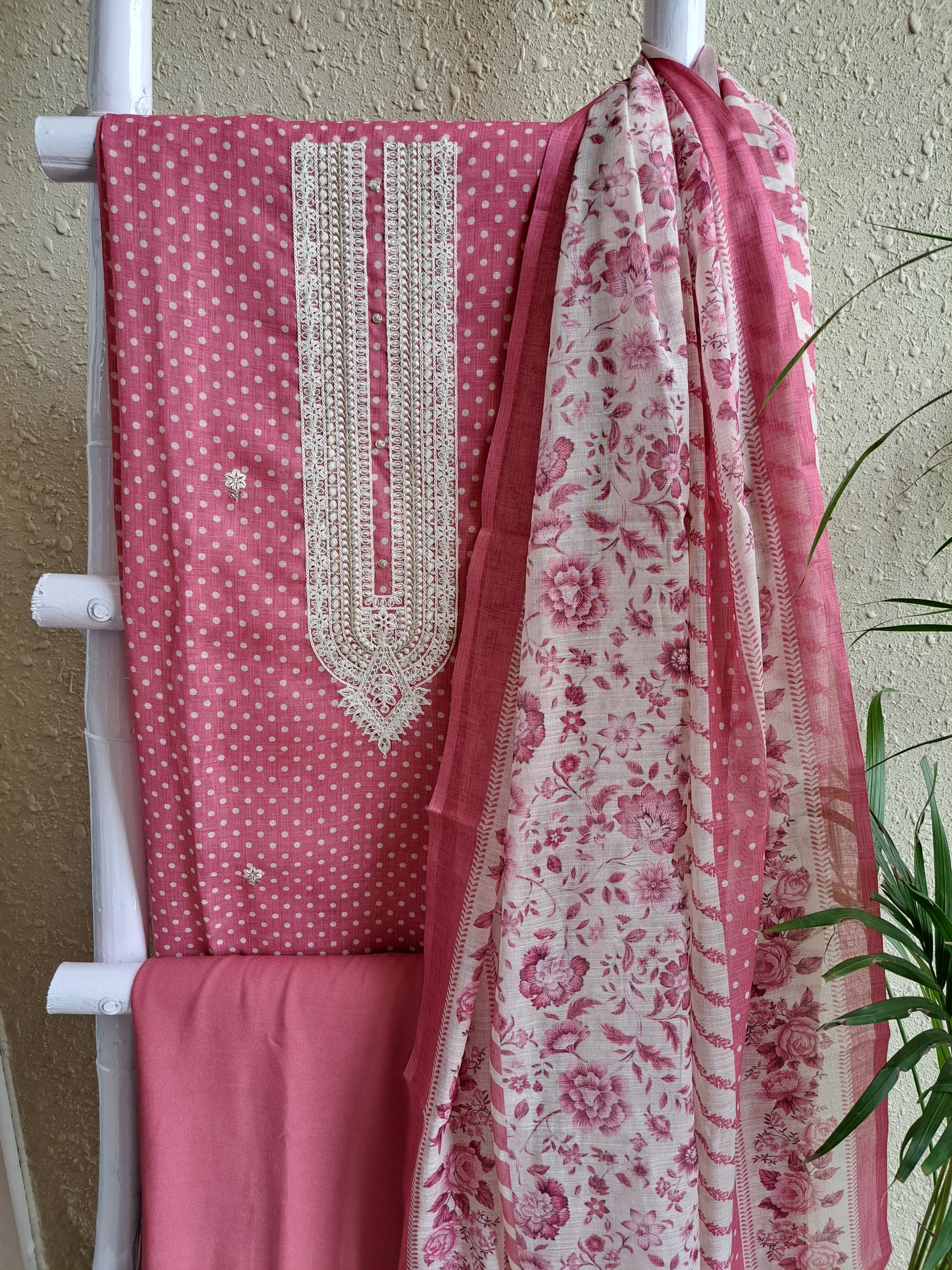 Elevate your everyday elegance with this rust-coloured Maheshwari suit set, enriched with block printing and artisanal details. The kurta features fine linear block prints and a statement Kantha work patch on the neckline — a long, rectangular motif that adds traditional charm.