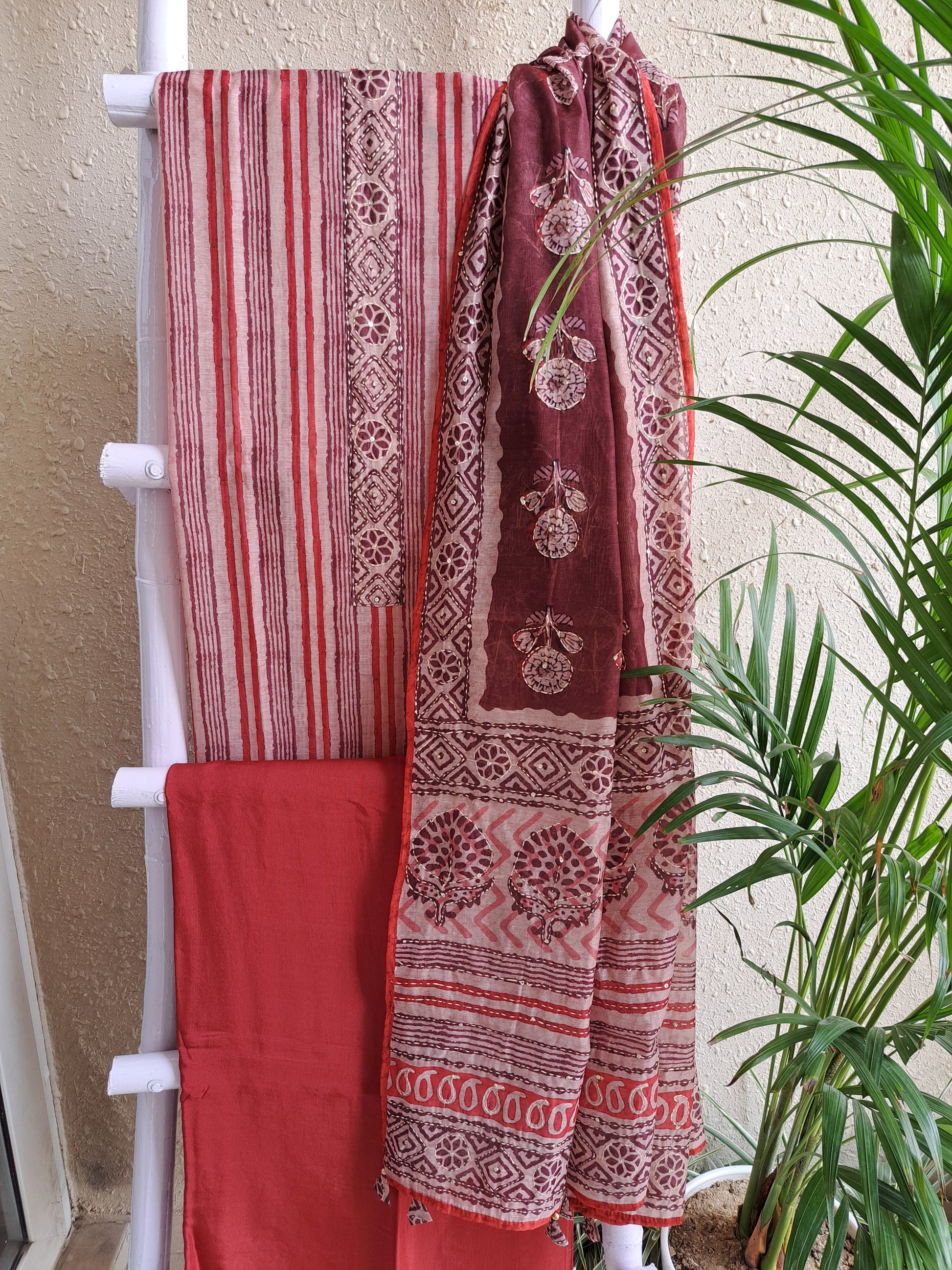 Elevate your everyday elegance with this rust-coloured Maheshwari suit set, enriched with block printing and artisanal details. The kurta features fine linear block prints and a statement Kantha work patch on the neckline — a long, rectangular motif that adds traditional charm.